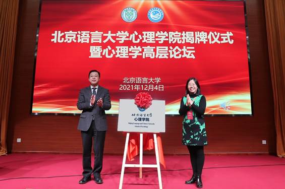在揭牌仪式上,中国科学院心理研究所所长傅小兰研究员和北京语言大学校长刘利教授共同为心理学院揭牌。