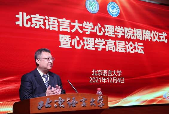 2021年12月4日,北京语言大学心理学院揭牌仪式暨心理学高层论坛在逸夫报告厅隆重举行。学校党委副书记、校长刘利教授出席揭牌仪式并致辞。揭牌仪式由学校党委副书记、纪委书记马贵生同志主持。