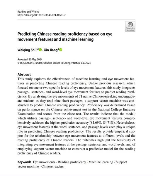 Shi, W., & Jiang, X. (2024). Predicting Chinese reading proficiency based on eye movement features and machine learning.Reading and Writing, 1-25.