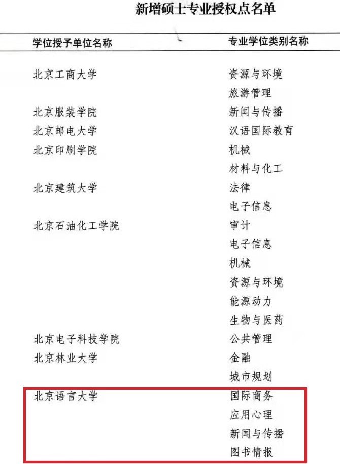 近日,国务院学位委员会下发《国务院学位委员会关于下达2020年审核增列的博士、硕士学位授权点名单的通知》(学位〔2021〕14号)。北京语言大学心理学院获批新增应用心理硕士专业学位授权点。此外,北京语言大学同时获批新增应用经济学、政治学、马克思主义理论、中国史、艺术学理论等5个一级学科硕士学位授权点,以及国际商务、新闻与传播、图书情报等3个硕士专业授权点。