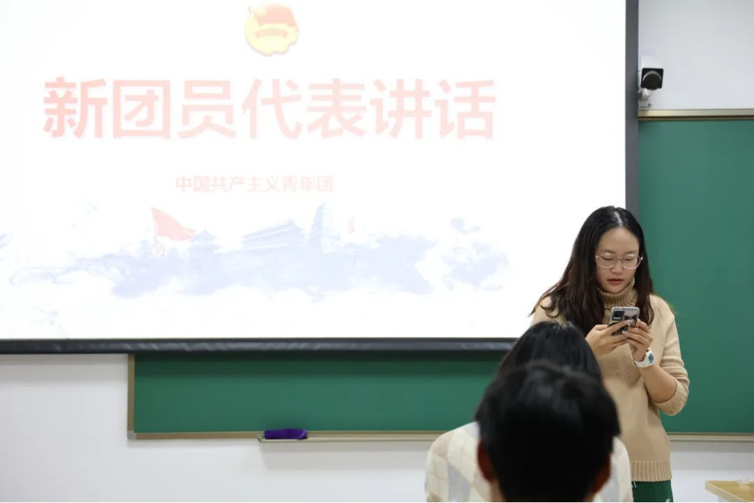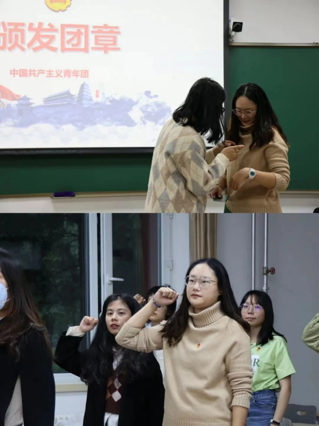 肖瑶获全数赞成票,正式加入中国共产主义青年团,成为心理学院21级本科生团支部的新成员。团支书曹雨彤为肖瑶颁发并佩戴团徽,随后肖瑶进行了入团宣誓,铿锵有力的誓言彰显着她青春热血与为团奉献的决心。