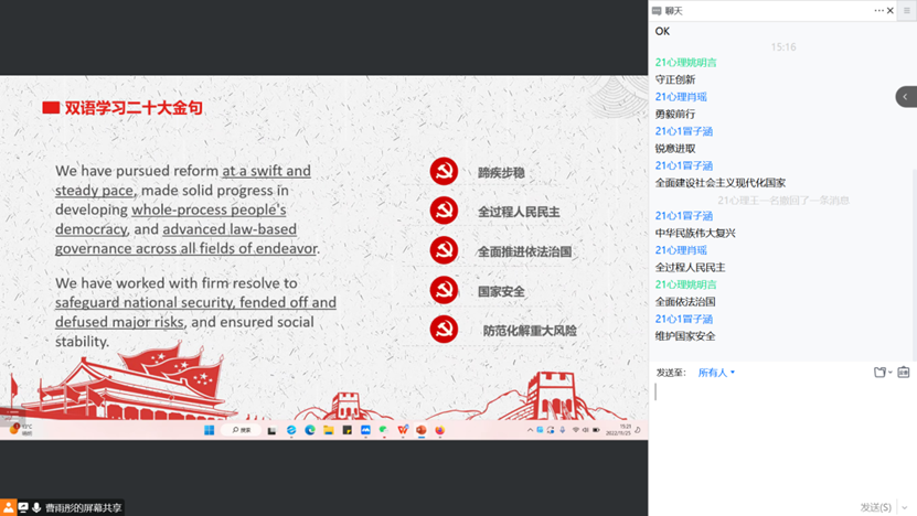 曹雨彤结合我校双语教学的特色,进行了双语学习二十大报告。在这个环节里,曹雨彤将二十大报告中的重点词汇英文版本展示给同学,同学们积极踊跃地将这些词汇原文准确翻译了出来,既达到了学习二十大报告的效果,也有利于同学们向校园中国际友人讲好中国故事,更大范围宣传二十大精神。