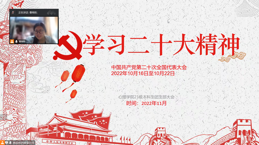 为深入学习党的二十大精神,心理学院21级本科生团支部于2022年11月25日开展了以“学习二十大精神”为主题的线上团日活动。