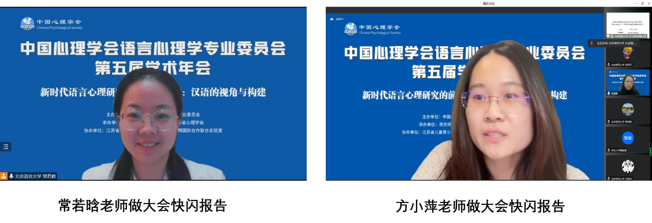 心理学院四名青年教师和一名硕士研究生做了大会快闪报告。12月3日下午,常若晗老师和方小萍老师分别做了题为“动作加工中的语义激活及动作信息量的影响:来自事件相关电位的证据”“New-meaning learning does not perturbate L2 lexical representations”的大会快闪报告。