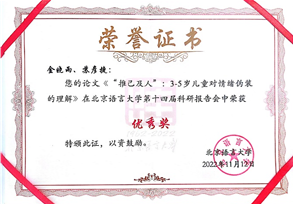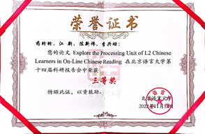 4月22日,北京语言大学第十四届科研报告会隆重召开。心理学院取得2项论文奖和1项集体奖。其中,药盼盼老师的论文《Explore The Processing Unit of L2 Chinese Learners In On-Line Chinese Reading》荣获论文三等奖,金晓雨老师的论文《“推己及人”:3-5岁儿童对情绪伪装的理解》荣获论文优秀奖。心理学院荣获“优秀组织奖”。