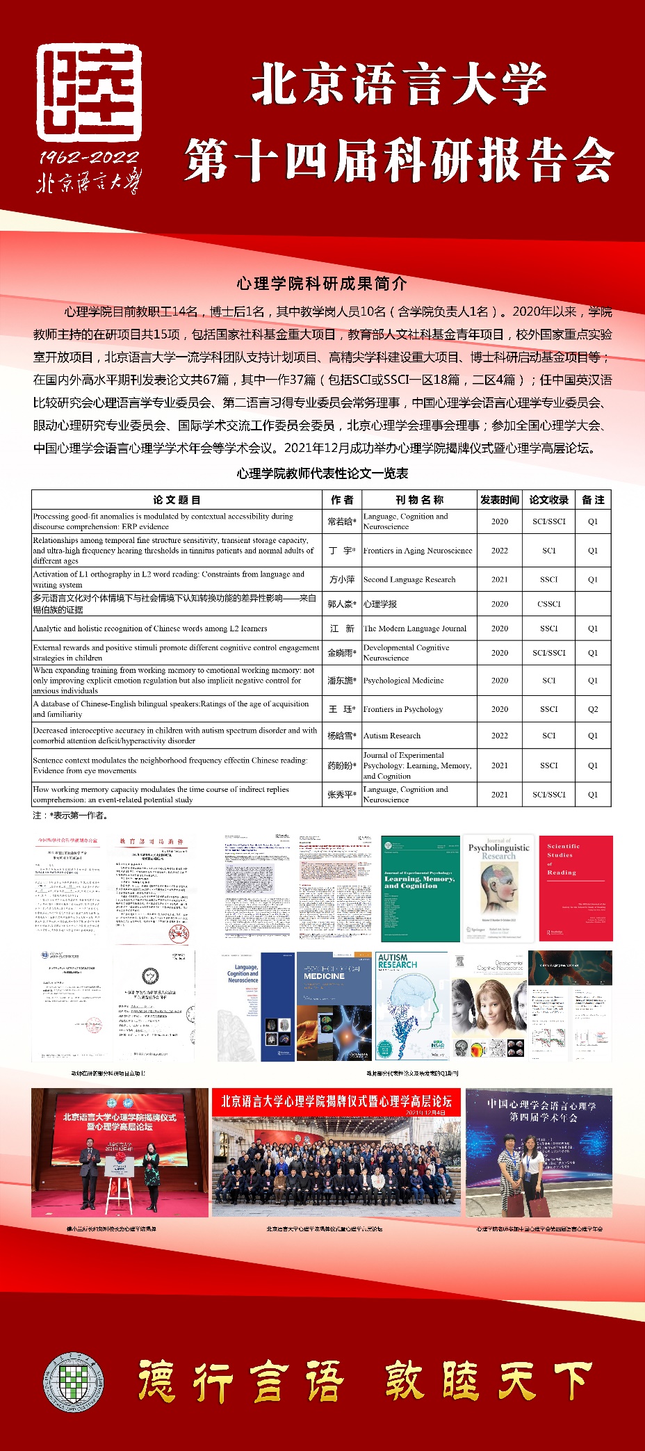 本届科研报告会还举办了各单位的科研成就展,以系列展板和视频动画的形式回顾了各单位近两年来(2021-2022)的科研成就。心理学院参加了此次展览。