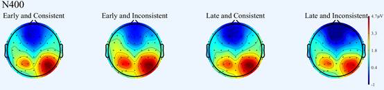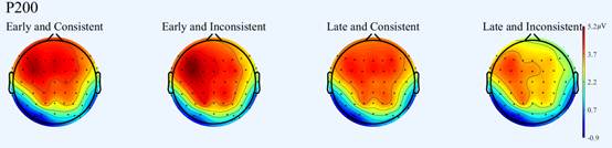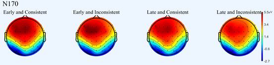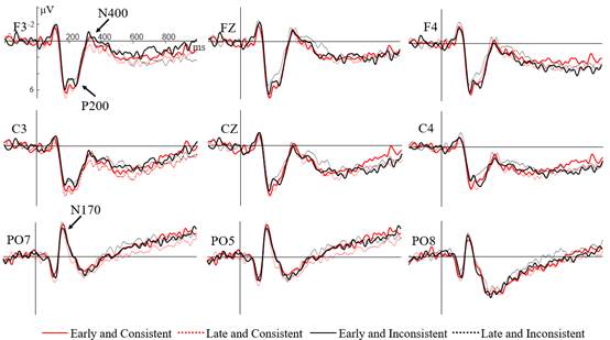该项研究邀请汉-英双语者完成英语词汇的命名任务并记录其ERP数据。研究结果显示,在N170,P200和N400成分上,二语词汇的习得年龄效应受到正字法-语音映射一致性的调节,即习得年龄效应在映射不一致时显著,在映射一致时不显著(见图1和图2)。这些研究结果表明,二语词汇的习得年龄效应来源于正字法-语音的联结,为任意映射假设的观点提供了直接的证据。
