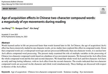 Wang, J., Chen, B. G., & Jiang, X. (2023). Age of acquisition effects in Chinese two-character compound words: a megastudy of eye movements during reading.Psychonomic Bulletin and Review.https://doi.org/10.3758/s13423-023-02329-8