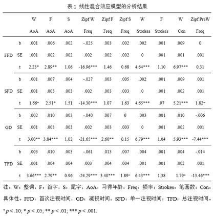 该项研究采用大样本研究范式结合眼动追踪技术,具体关注复合词整词、首字以及尾字的习得年龄在复合词加工中的作用。研究结果发现,在汉语双字复合词的阅读中,双字词整词和首字的习得年龄对复合词加工的影响从加工的早期就出现,一直持续到加工的晚期。尾字的习得年龄不影响复合词的加工(见表1)。以上结果表明双字复合词的习得年龄效应存在于不同的加工阶段,这与任意映射假设的观点一致。