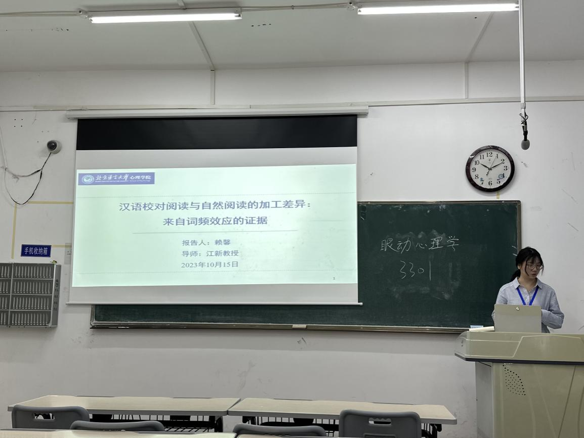 江新教授指导的2023级博士研究生赖馨同学在“眼动心理学专业委员会”口头报告分场上做了题为“汉语校对阅读与自然阅读的加工差异:来自词频效应的证据”(作者:赖馨、江新)的报告。