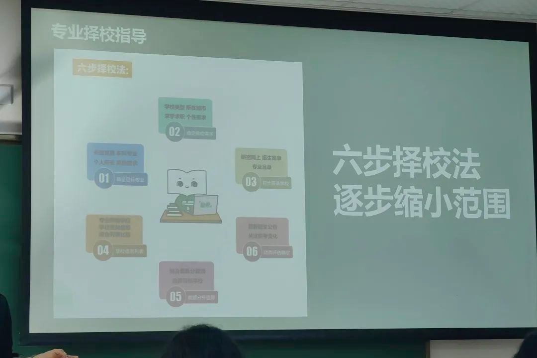 接下来,他向大家介绍了讲座中最为核心的内容,即专业择校指导。他建议使用“六步择校法”逐步缩小择校范围,即确定目标专业、确定院校需求、初步筛选学校、学校信息列表、数据分析选择和动态评估确定,并提醒大家可以从研招网平台获取考研相关信息。