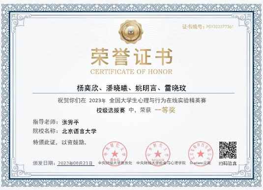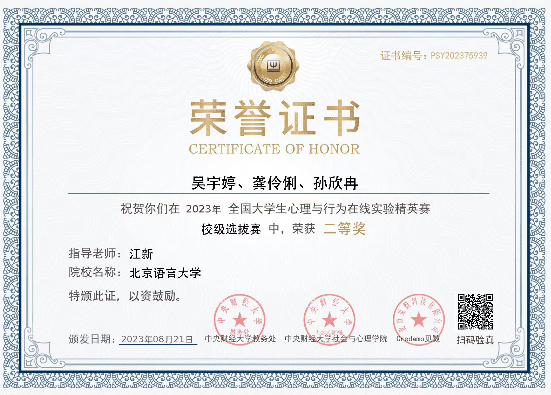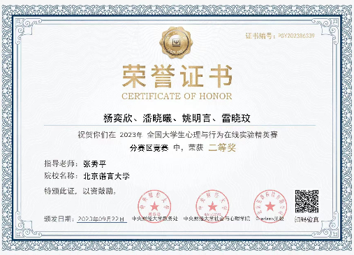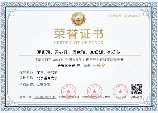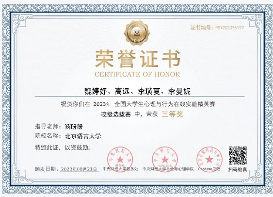2023年10月15日,首届全国大学生心理与行为在线实验精英赛全国总决赛正式落幕。北京语言大学心理学院在此次全国性竞赛中荣获多个奖项。由心理学院研究生夏师涵、尹心月、周意翔、孙荧英、李娟妮组成的“隐含你心意”团队荣获全国总决赛三等奖,该团队指导教师、心理学院教师丁宇博士荣获优秀指导老师奖,北京语言大学荣获最佳院校组织奖。