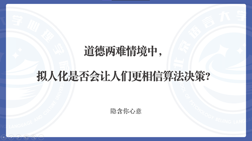 “隐含你心意”团队参赛的研究报告题目为“道德两难情境中,拟人化是否会让人们更相信算法决策?”。该研究探讨了在道德两难情境中应用算法决策时的“人机信任”问题,重点关注拟人化对个体算法决策态度的影响。探讨有关人工智能和算法对个人心理和行为的影响及机制、人类个体对人工智能和算法对态度及互动规律,提高人-机、人-算法之间的良好互动及有效相互支持。本研究的发现有助于更好地理解在道德决策中,个体的拟人化倾向和算法的拟人化程度如何影响人们对算法决策的态度,为人工智能领域人机信任问题的发展提供了心理学角度的借鉴。