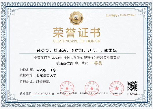 校赛一等奖队伍晋级分赛区竞赛,团队成员在校赛阶段实验设计的基础上,与指导老师进一步沟通交流,将实验设计逐步落实,收集数据并撰写研究报告。经过层层选拔,在北部赛区竞赛中,心理学院共获得一等奖1名,二等奖1名。