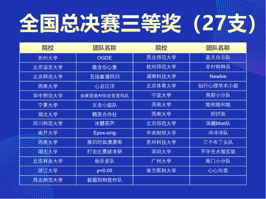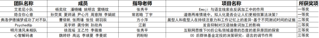 分赛区竞赛获奖情况各参赛团队从撰写研究计划、数据收集与分析,到最后的论文答辩,在比赛过程中深入了解心理与行为在线实验的流程、设计原理与数据分析方法,提高了运用所学知识解决理论与现实问题的能力以及团队协作能力。