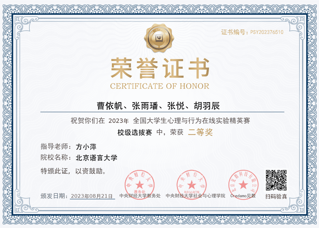 全国大学生心理与行为在线实验精英赛是旨在培养全国大学生心理学在线实验设计、分析与研究能力的比赛,鼓励跨年级、跨专业组队,促进跨学科交流与合作。2023年全国大学生心理与行为在线实验精英赛由全国应用心理专业学位研究生教育指导委员会、中国心理学会经济心理学专业委员、中国社会心理学会大数据网络心理学专业委员会指导,中央财经大学国家级实验教学示范中心主办,中央财经大学社会与心理学院、Credamo见数联合承办。