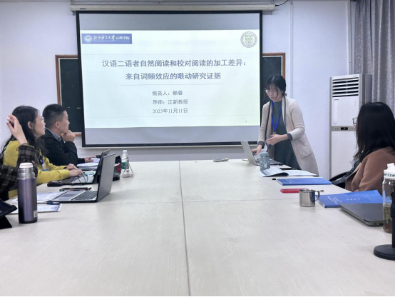 江新教授指导的2023级博士研究生赖馨同学在“语言与认知”的专题论坛上做了题为“汉语二语者自然阅读和校对阅读的加工差异:来自词频效应的眼动研究证据”的报告。