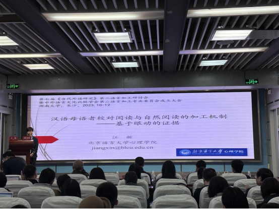 2023年11月10日至12日,由《当代外语研究》和中外语言文化比较学会第二语言加工专业委员会主办、湖南大学外国语学院承办的第七届《当代外语研究》第二语言加工研讨会暨中外语言文化比较学会第二语言加工专业委员会成立大会在湖南大学外国语学院顺利召开。本次会议以“智能化时代学科交叉背景下的第二语言加工研究”为主题,围绕语音、词汇、句法、语义、语用和认知加工等议题展开讨论。会议吸引了来自国内高校的90多名专家学者前来参会。北语心理学院多名师生受邀参加此次学术盛会。