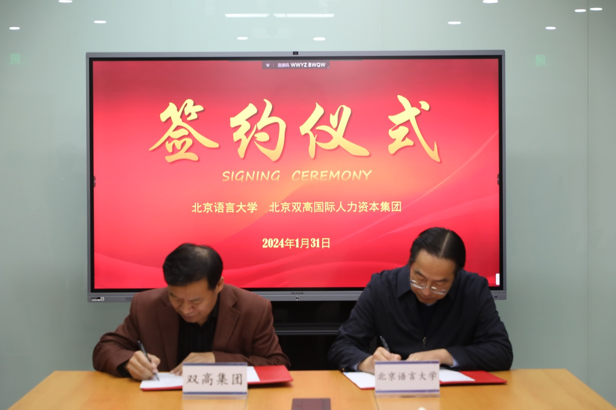 为搭建校企交流合作平台,拓宽毕业生就业渠道,1月31日,北京语言大学与北京双高国际人力资本集团有限公司(简称双高集团)签署共建实习实践基地协议,并举行揭牌仪式。北京语言大学党委常委、副校长黄益方,北京语言大学心理学院院长江新,北京语言大学语言科学院党总支书记彭恒利,双高集团党委书记、董事长彭方军,双高集团党委委员、副总经理郭忠良等以及相关部门负责人出席仪式。仪式由郭忠良副总经理主持。