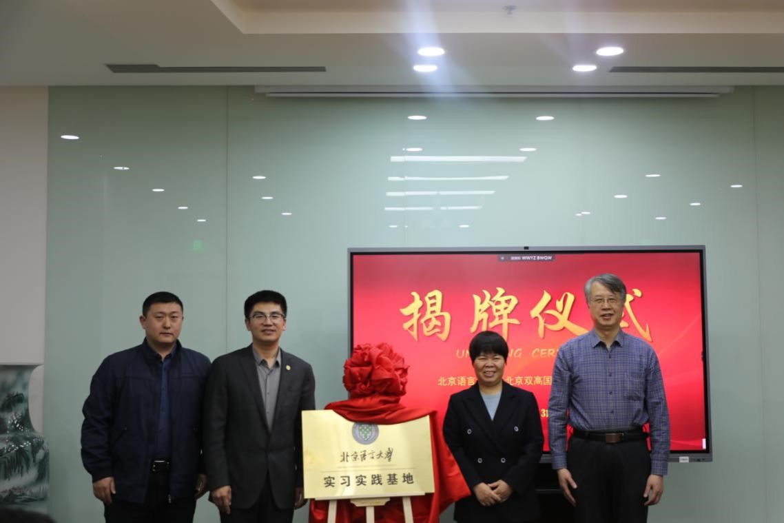 心理学院院长江新、语言科学院党总支书记彭恒利、双高集团副总经理郭忠良、双高集团人才与领导力测评二部总经理王亮共同为“北京语言大学实习实践基地”揭牌。