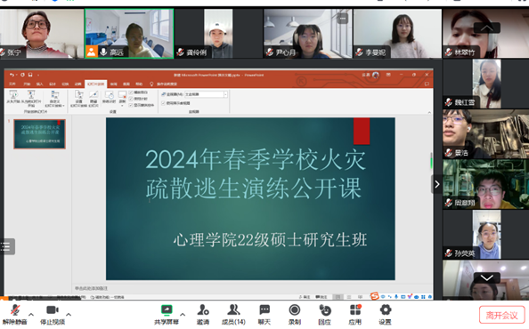 2024年3月15日晚上7点,北京语言大学心理学院22级研究生在腾讯会议上集中观看了国家消防局、教育部联合举办的“2024年春季学校火灾疏散逃生演练公开课”。本次公开课旨在通过现场讲授与视频案例讲解相结合的方式,向同学们普及校园安全知识、增强防火意识,使同学们认识到火灾带来的危害,并掌握相应的逃生自救技能,从而保障校园的安全。