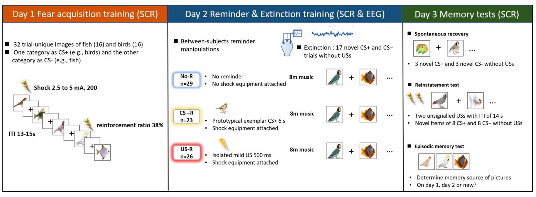 在三天的实验设计中,首先进行恐惧条件反射习得;第二天进行提醒和消退程序,并且进行了头皮脑电图记录;第三天则是恐惧恢复以及情景记忆测验。