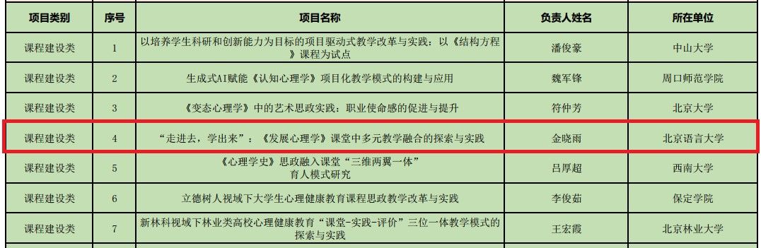 近日,教育部高等学校心理学类专业教学指导委员会公布了2023-2024年度心理学教指委教育教学改革项目立项名单。我院教师金晓雨博士主持的项目“‘走进去,学出来’:《发展心理学》课堂中多元教学融合的探索与实践”获批课程建设类教改项目立项。这是教育部高校心理学类专业教指委设立教改项目以来我校首次获批此类项目。