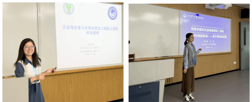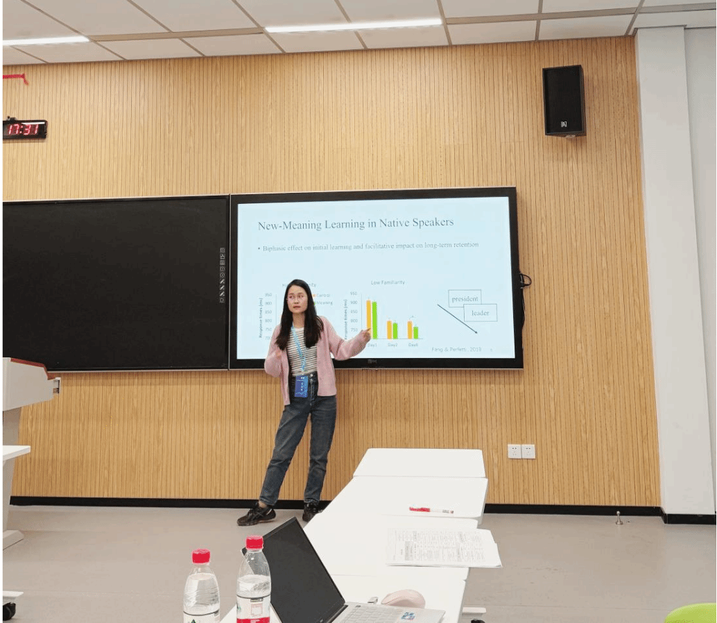 在“汉语二语加工”专题论坛上,心理学院青年教师张秀平副教授做了题为“Time course of indirect reply processing in native and non-native Mandarin speakers: An ERP study”的报告,江新教授指导的2022级硕士研究生龚伶俐同学做了题为“同音字数对汉语母语者和二语者拼音词识别的影响——基于眼动的证据”的报告。