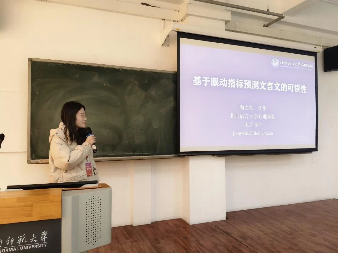 陶雯祎同学在会上做了题为“基于眼动指标预测文言文的可读性”(作者:陶雯祎、江新)的分组报告。她在简要介绍文本可读性以及基于眼动指标预测文本可读性的研究现状的基础上,提出了基于眼动指标预测文言文可读性是否可行的问题,然后详细介绍了近期完成的一项基于眼动指标预测文言文可读性的研究,研究发现基于注视次数可以有效预测文言文的可读性。报告引发了与会师生的浓厚兴趣和热烈讨论,现场师生肯定了该研究的意义和价值,并就文言文材料的选取、眼动指标的选取等问题等进行了深入的互动交流,提出了不少建设性的意见。