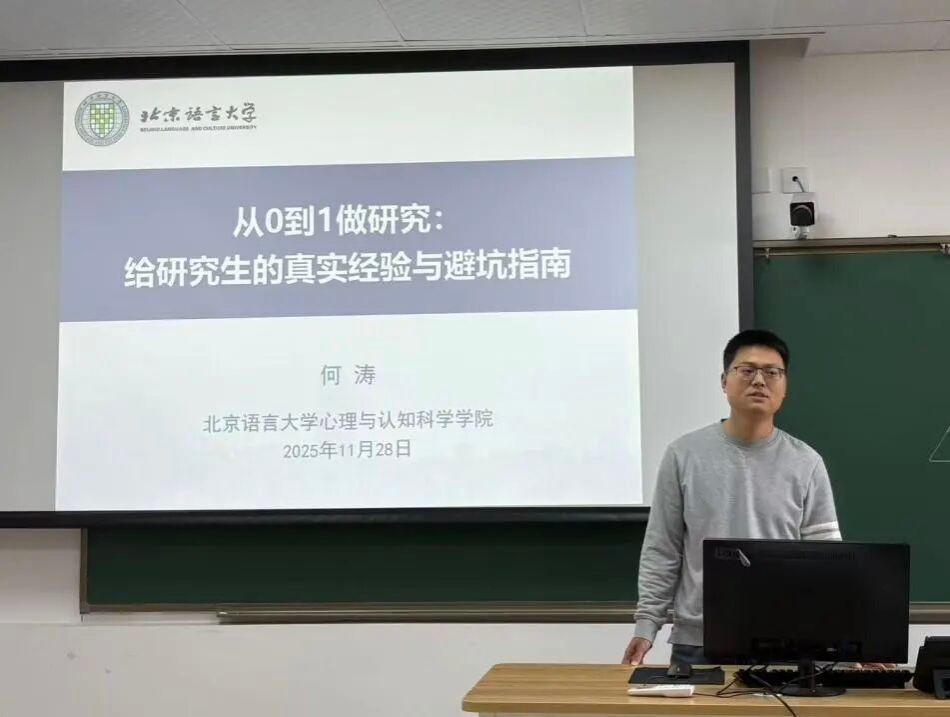 为助力研究生新生快速适应研究生阶段的学习,平稳实现从 “被动接受知识的学生” 到 “主动探索未知的科研人” 的转变,2025年11月28日下午,心理与认知科学学院研究生会成功举办科研经验分享会。本次分享会特邀学院副研究员、硕士生导师何涛老师担任主讲嘉宾,围绕科研思维重塑、文献阅读技巧、科研流程实操及常见误区规避等内容,为初入科研领域的新生们带来一场兼具理论深度与实践价值的科研入门指导盛宴。