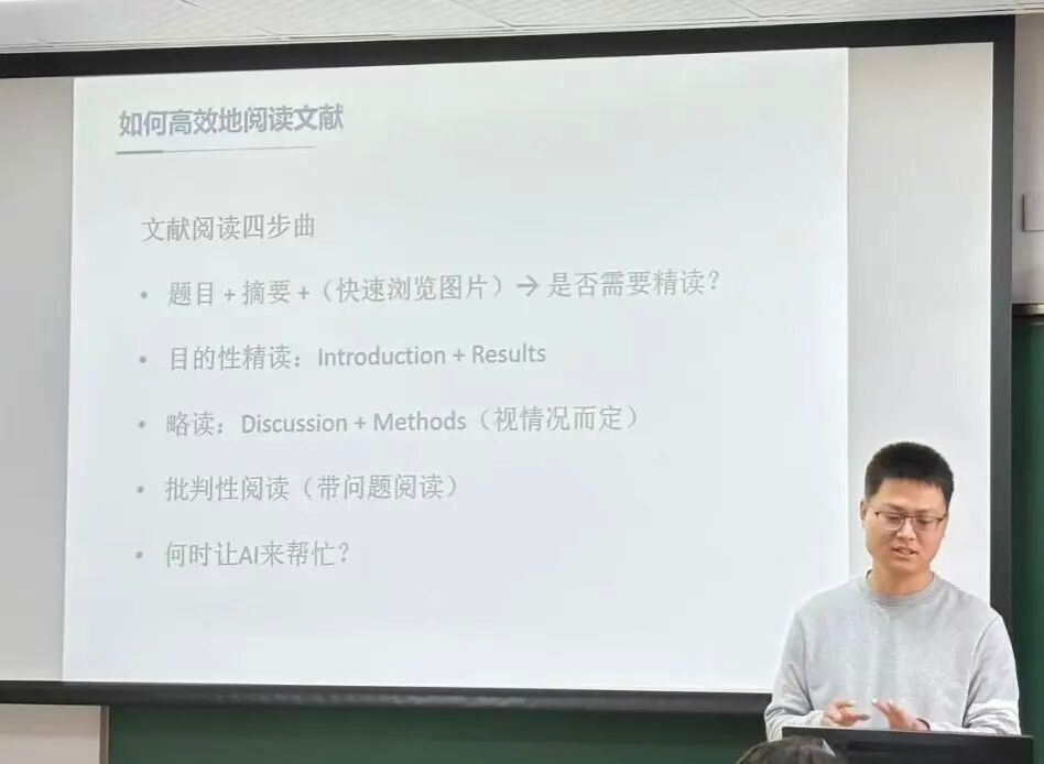 在文献阅读作为科研入门的基础环节,何涛老师分享了高效实用的方法技巧。他建议新生要先通过题目和摘要判断文献相关性,必要时快速浏览图片及说明辅助筛选;精读引言和结果部分,以批判性思维审视研究问题与结论,提升学术思考能力;讨论和方法部分可根据阅读目的灵活选择略读或精读,重点学习作者的论证逻辑与研究设计思路。同时,他提醒大家合理使用AI工具,先自主思考再借助技术辅助,避免思维固化。文献管理方面,何涛博士推荐了Zotero、Endnote等工具,帮助新生高效整理文献与引用资料,省去手动整理的繁琐。