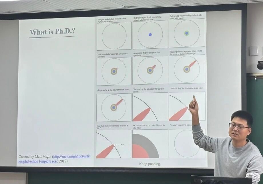 针对新生常见的科学研究误区,何涛老师也给出了针对性避坑指南:注重过程管理而非单纯追求结果,通过规范各环节提升成功概率;避免犹豫纠结,秉持“先行动再完善”的原则推进研究;摒弃完美主义,不钻牛角尖,聚焦核心研究方向;及时记录想法与实验细节,为后续分析与回顾留存关键资料。最后,他还解读了PhD的核心意义,他表示,博士阶段是逐渐靠近并突破人类知识边界的过程,即便突破微小,也能为学科发展与知识进步贡献力量,鼓励新生以长远眼光看待科研之路。