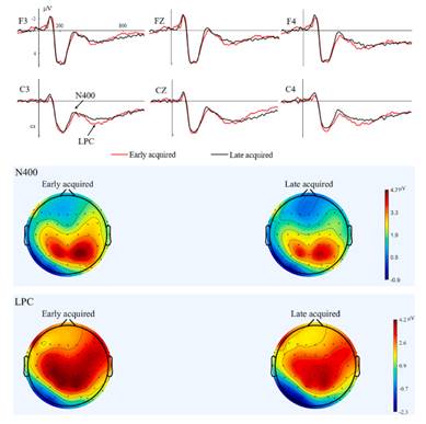 图1. 早期和晚期习得的L2词汇在N400和LPC上的平均波幅图(上)和地形图(下)
