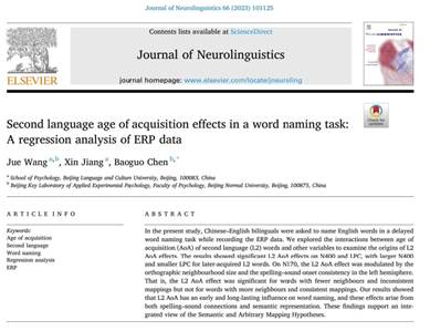 近期,心理学院博士后研究人员王珏等在国际神经语言学刊物Journal of Neurolinguistics(SSCI,Q1,IF= 2.38)期刊上发表了题为“Second language age of acquisition effects in a word naming task: A regression analysis of ERP data”的论文。该研究揭示了第二语言词汇的习得年龄效应的认知神经机制。