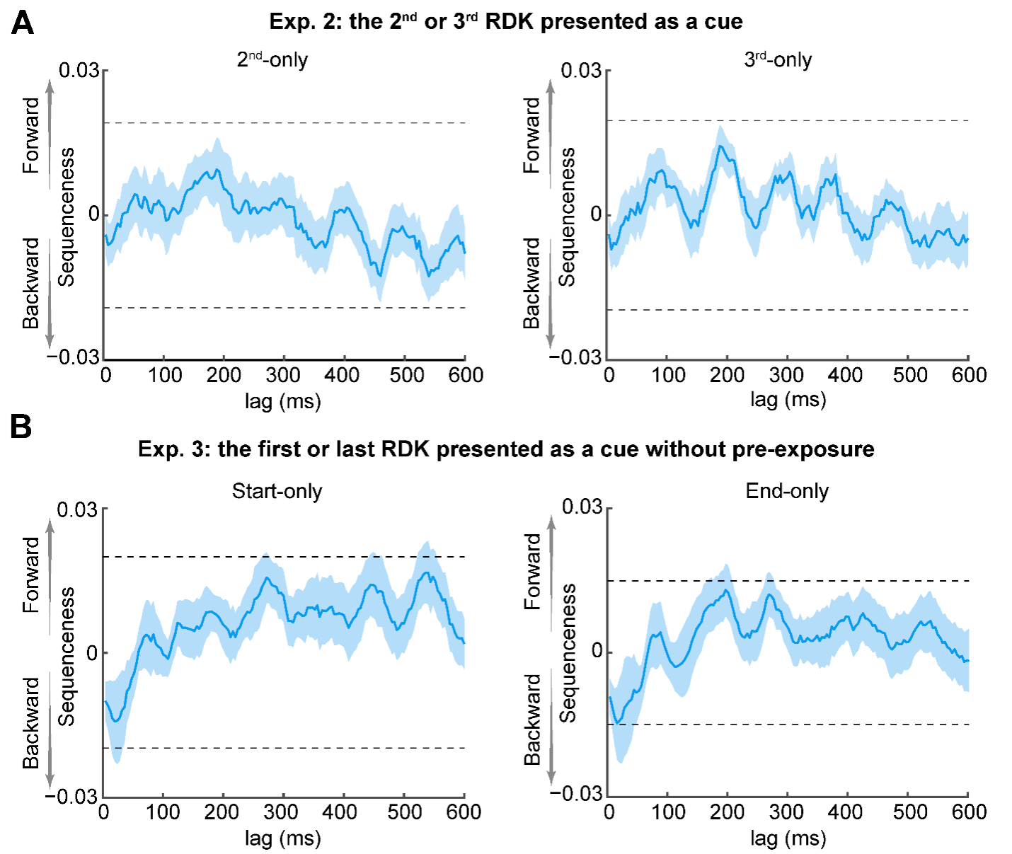 图2 (A) 实验2结果。使用序列中的第二或第三个运动方向作为线索时,未发现正向或反向神经活动回放的证据。(B)实验3结果。在减少暴露时长的情况下,仍能能够观察到一定程度的反向神经活动回放现象。