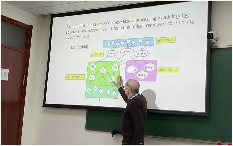 Taft教授在课上主要介绍了语言学习过程中的认知表征与模型,论述了母语者和二语者在英语词汇加工过程中的不同点,简要介绍了当静默阅读时,词汇的语音信息是如何被提取的。Taft教授重点提出了处理汉字的认知模型,并强调“Lemmas”连接了汉字的字形和读音,在汉字的形式和功能之间起到调节作用。