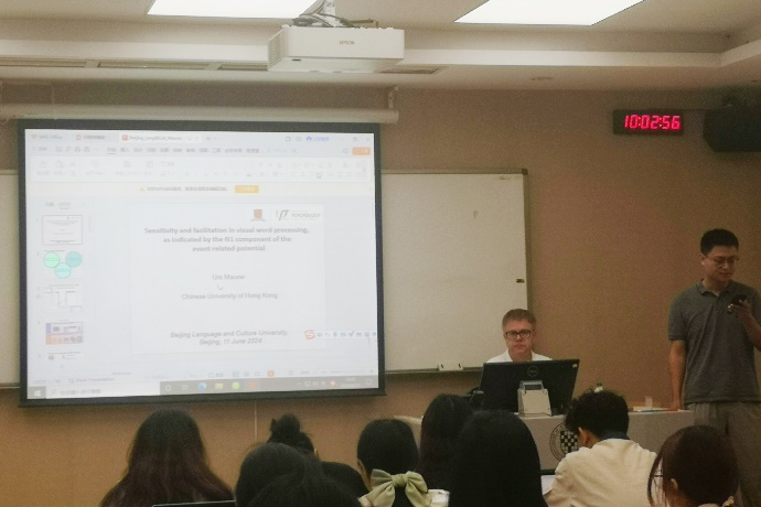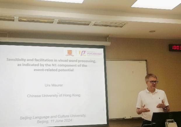 2024年6月11日,香港中文大学Urs Maurer为我校师生作题为“Sensitivity and Facilitation in Visual Word Processing, as Indicated by the N1 Component of the Event-Related Potential”的学术报告。报告是语言认知科学学科创新引智基地第六届“语言习得、认知与脑科学学术论坛”系列讲座之一,基地主任助理何涛博士主持,全校四十余名师生参加。