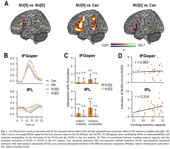 本研究纳入主语宾语生命性异同这一因素,选取汉语宾语前置句为研究对象,通过不同类型句子对比,创新性地分离出句子理解加工中的语序、语法标记和语义关系三种信息的驱动作用,揭示了在句子理解过程中,句内各成分之间的语义关系驱动句法分析在左侧额下回岛盖部产生更强激活,而非语义整合的脑区。在更广泛的层面上,这一研究发现提示后续相关研究在解释与句法加工相关的神经活动时,应当考虑到语义信息驱动句法分析的影响,尤其是对于有效句法线索较少的结构,如非典型语序句和句法违反句。