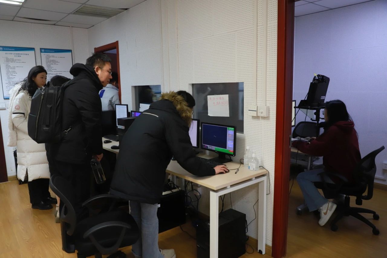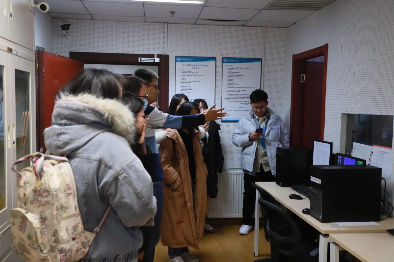 第五部分,是Eyelink眼动仪上机实操与答疑环节。全体学员共分成四个小组,在何涛博士等人的带领下,依次到语言认知科学学科创新引智基地眼动实验室进行上机实操。学员们在实操时分别担任主试或被试,亲自动手校准仪器,参与眼动实验。何涛博士对学员们在实操中或之前研究中遇到的问题进行详细分析。