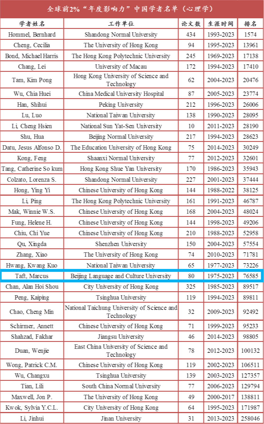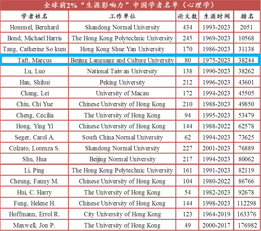 北京语言大学语言认知科学学科创新引智基地特聘教授Marcus Taft荣登全球前2%“生涯影响力”榜单和全球前2%“年度影响力”榜单。