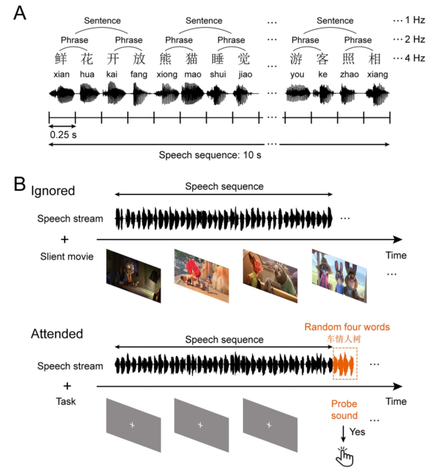 图1, A:听觉言语刺激包含字、词、句三种语言层级结构,对应呈现频率为4 Hz、2 Hz、1 Hz。B:被动与主动注意实验流程示意图。