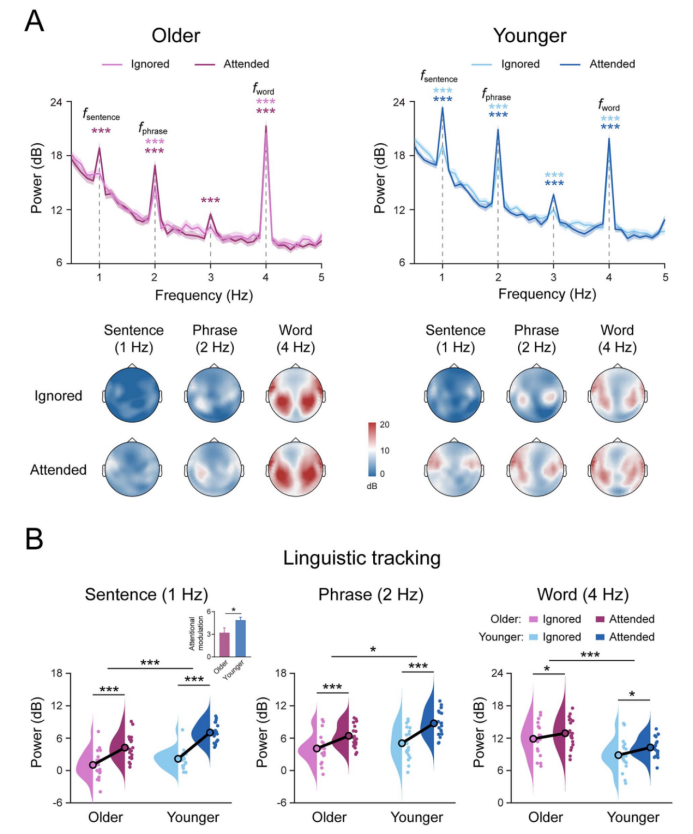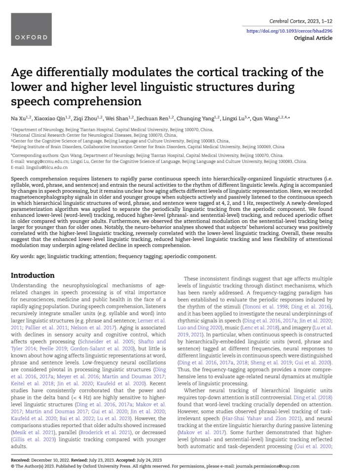 Xu N, Qin X, Zhou Z, Shan W, Ren J, Yang C, Lu L*, Wang Q*. Age differentially modulates the cortical tracking of the lower and higher level linguistic structures during speech comprehension. Cereb Cortex. 2023 Aug 11:bhad296. doi: 10.1093/cercor/bhad296.