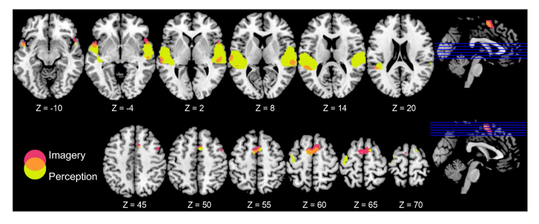 研究发现,在被试想象听古诗和真正听古诗时,均激活了双侧颞上回(STG)的部分区域及补充运动区(SMA)。在进行连续言语的内部构建过程中,即使并没有出现真正的听觉刺激,次级听皮层区域也通过大脑“自上而下”的方式被激活。此外,左侧额上回(IFG)的Broca区在imagery-perception的对比中被显著激活,说明即使是在想象“听”到言语而非“说”言语时,运动语言区仍然参与了言语想象过程。IFG和STG的激活程度还与被试自我报告的想象生动程度存在潜在的关联。这一研究成果使用更贴近日常生活的连续言语(中国古诗)作为材料,为言语想象的神经机制提供了重要的实证证据。