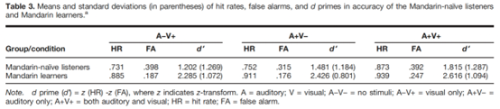 综上,我们的研究揭示了视听整合在声调感知中的优势和劣势,以及跨模态整合与高变异语音对声调感知的共同作用,对声调感知的语音符号化和范畴化理论有所启示。