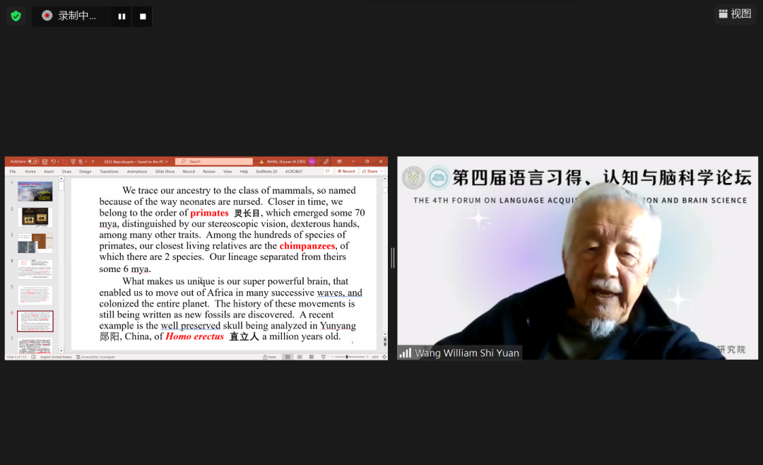 王士元教授从历史语言学视角出发,在人类历史发展和个人生命周期两个宏观维度上讨论了语言的重要性以及语言的演化发展,强调了人类精密的大脑和基于其上的变化无穷的语言造就了人类不同于其它动物的独特性。王士元教授认为,需将传统的语言学研究与新兴的神经科学手段结合起来进行更深入的探索。王士元教授还分享了关于老龄化认知衰退的研究,他认为在目前的老龄化社会,这一研究方向大有可为,具有很高的社会价值。