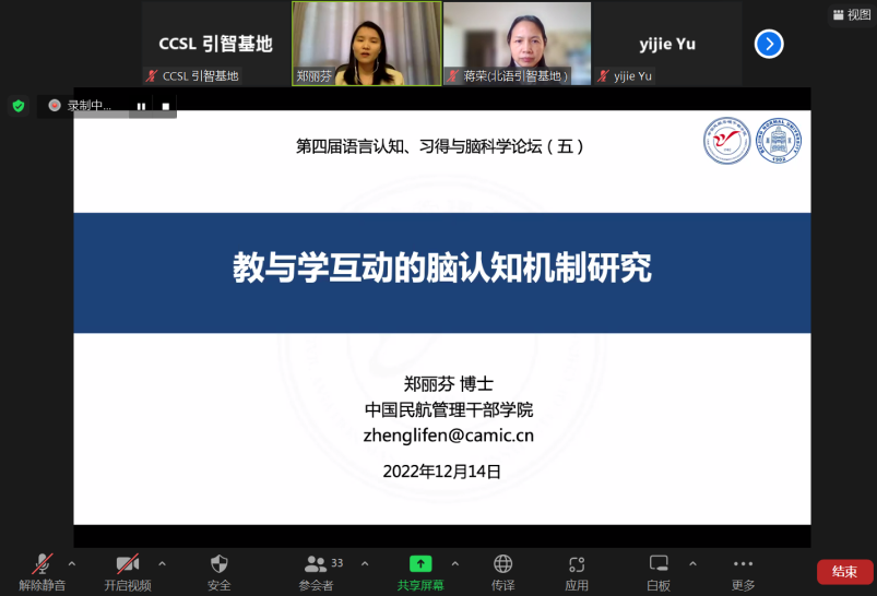 2022年12月14日,中国民航管理干部学院郑丽芬博士应邀为我校师生在线上做了一场精彩学术报告,报告题目为“教与学互动的脑认知机制研究”。本次报告是基地“第四届语言习得、认知与脑科学论坛”的第五讲,报告由引智基地副主任蒋荣主持,参会人员近五十人。