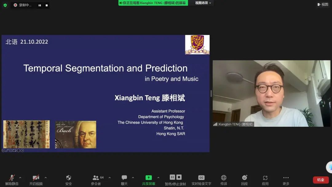 2022年10月21日,应基地邀请,香港中文大学心理学院滕相斌助理教授为我校师生做了一场精彩有趣的学术报告,报告题目为“巴赫遇上杜甫:绝句与赞歌中的时域分割和预期”,报告在线上举行。本次报告是基地主办的“第四届语言习得、认知与脑科学学术论坛”第三讲。报告由基地专职研究人员陆灵犀副研究员主持,校内外共七十余人参加。