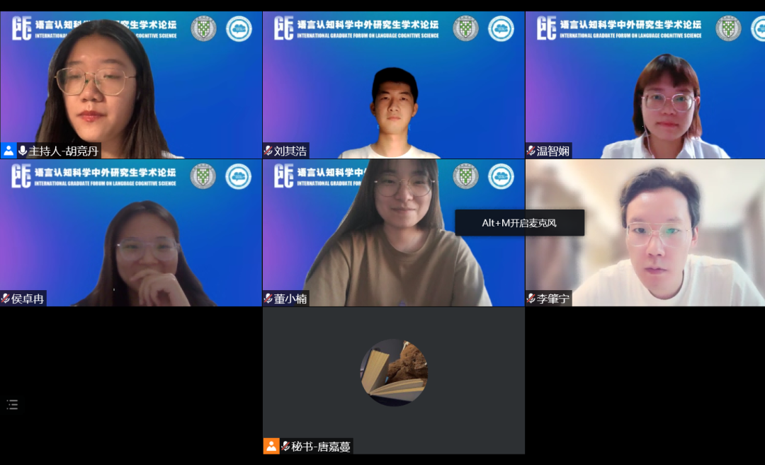 论坛组织了15场线上小组报告,内容主要围绕语言习得与认知、语言认知与加工机制、语言学研究、认知语言学、语言认知神经科学等五个主题。小组报告人积极分享最新研究成果,认真倾听其他同学的研究,并对疑问和感兴趣的内容进行了深入探讨和交流,小组报告会议气氛热烈。
