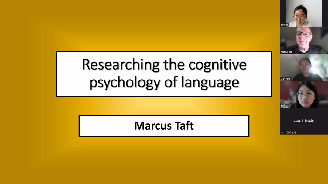 2021年5月20日,应语言认知科学学科创新引智基地邀请,基地特聘教授 Marcus Taft 为北语师生开设研究生国际课程,在线上讲授《实验设计与研究》。第一讲题为 “Researching the cognitive psychology of language”,国际课程采用 ZOOM 线上会议形式,第一讲共吸引校内外四十余名师生参加。