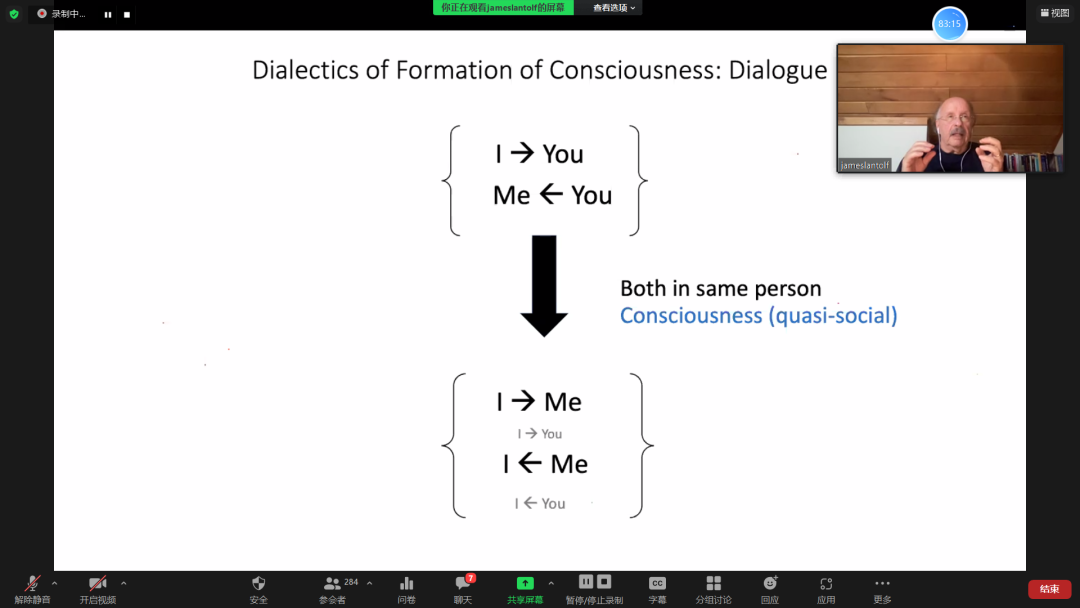 北京时间9月16日晚第一讲开讲,题为“Introducing SCT”。在第一讲中,Lantolf教授主要对二语习得中的重要理论——社会文化理论的起源和内涵进行了简要介绍。首先,Lantolf教授从对“Sociocultural Theory”和“Cultural-Historical Psychology”两个概念的比较和解释出发,层层深入地阐释了社会文化理论的代表学者L.S. Vygotsky的研究目标和研究方法。其次,Lantolf教授提出社会文化理论的核心其实是语言的发展,这也正是他所感兴趣的领域。围绕这个话题,Lantolf教授进行了非常深入的思考和探讨,比如说如何考察意识(Consciousness)的存在以及Brain和Mind的关系等。接下来,Lantolf教授进一步阐述了社会文化在心理学中的重要性,人类的生物本能和先天条件是差不多的,但是因为环境和文化的不同,我们才会有不同的行为和活动,生物本能和社会文化共同作用,缺一不可。然后,Lantolf教授介绍了环境(Environment)、符号和工具(Signs and Tools)在社会文化理论中的意义和作用,并提出了许多和汉语相关的生动有趣的例子,与参会师生进行了积极的互动。最后,Lantolf教授提出了和人类意识相关的模型,并详细介绍了其中的成分。